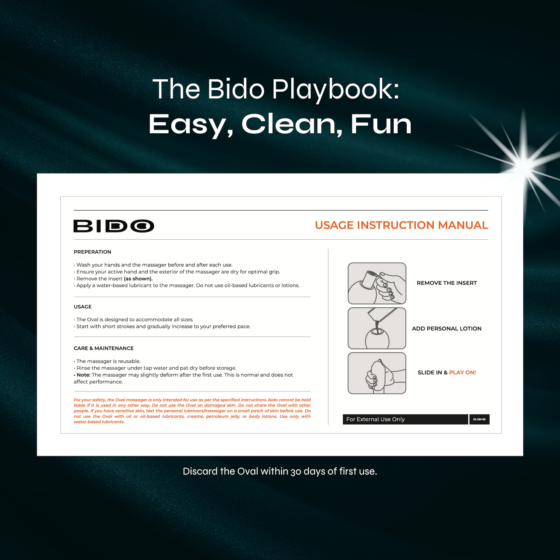 - Always wash the Oval before and after use. Dry completely before storage.